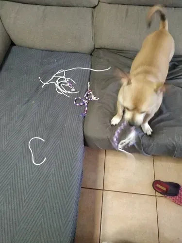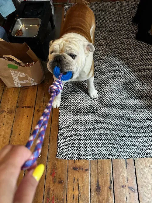 "OMG, this toy is a game changer! My pup is obsessed with it, and it's helped a ton with his anxiety when I'm at work. I luv that it's cleaning his teeth too. It's super durable, and I'm amazed it still looks new after weeks of play. Highly recommend for any dog parent!🐾"